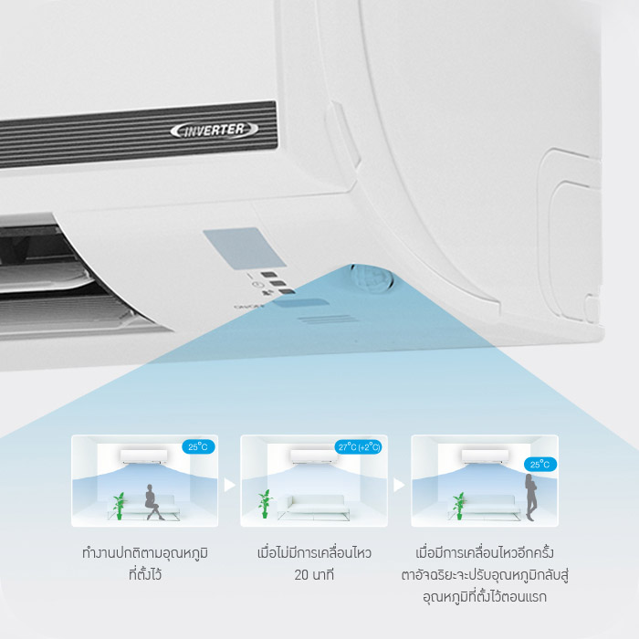 | ปรับอุณหภูมิขึ้น 2 องศา เมื่อไม่มีการเคลื่อนไหว 20 นาที | • |