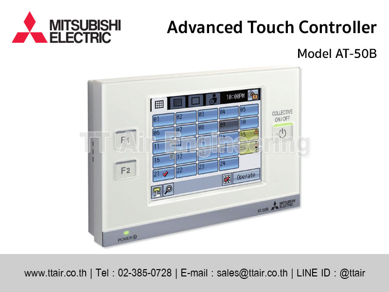 Advanced Touch Controller AT-50B เป็นชุดควบคุมส่วนกลางแบบรวมศูนย์ของ MITSUBISHI ELECTRIC มีฟังก์ชันการทำงานระดับสูง สามารถควบคุมอุปกรณ์ภายในได้สูงสุดถึง 50 เครื่อง ปรับแต่งการใช้งานได้หลากหลาย ดีไซน์ทันสมัยด้วยหน้าจอสัมผัสแบบ Touch Screen ขนาด 5 นิ้ว ช่วยให้ควบคุมอุณหภูมิและการทำงานของเครื่องภายใน Indoor Unit ได้อย่างสะดวกสบาย สามารถตั้งการทำงานของเครื่องปรับอากาศได้เป็นรายวันหรือรายสัปดาห์ เพื่อการตั้งค่าอุณหภูมิที่เหมาะสมสําหรับทุกสภาพแวดล้อม