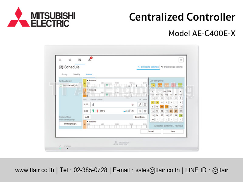 Centralized Controller AE-C400E-X เป็นชุดควบคุมส่วนกลางแบบรวมศูนย์ของ MITSUBISHI ELECTRIC มีฟังก์ชันการทำงานระดับสูง เช่น การควบคุมส่วนกลางแต่ละส่วน การควบคุมแบบกลุ่ม การควบคุมเฉพาะกลุ่ม โดยการควบคุมจากส่วนกลาง สามารถควบคุมอุปกรณ์ภายในได้สูงสุดถึง 400 เครื่อง ปรับแต่งการใช้งานได้หลากหลาย และมีดีไซน์ทันสมัยด้วยหน้าจอสัมผัสแบบ Touch Screen ขนาด 12.1 นิ้ว ช่วยให้ควบคุมอุณหภูมิและการทำงานของเครื่องภายใน Indoor Unit ได้อย่างสะดวกสบาย ด้วยความสามารถในการตั้งค่าอุณหภูมิที่เหมาะสมสําหรับทุกสภาพแวดล้อม