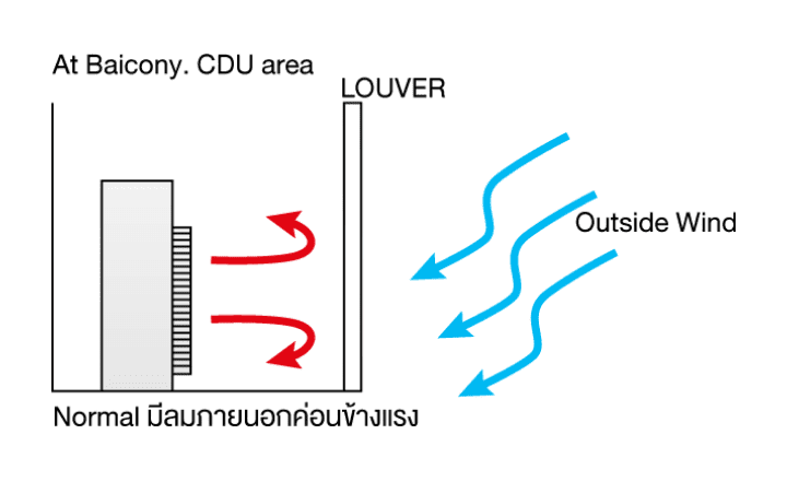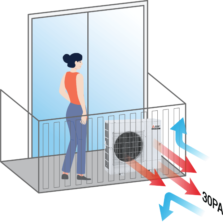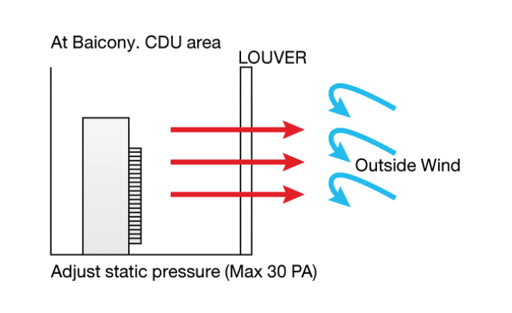 ปรับแรงระบายลมร้อนช่วยเพิ่มประสิทธิภาพการทำงาน กรณีติดตั้งในพื้นที่ระบายความร้อนได้ยาก หรือมีลมปะทะด้านหน้าของ คอนเดนซิ่งยูนิตทำให้เครื่องระบายความร้อนไม่ดีเท่าที่ควร สามารถปรับความแรงลมได้ถึง 30 Pa เพิ่มประสิทธิภาพระบายความร้อนได้มากขึ้น