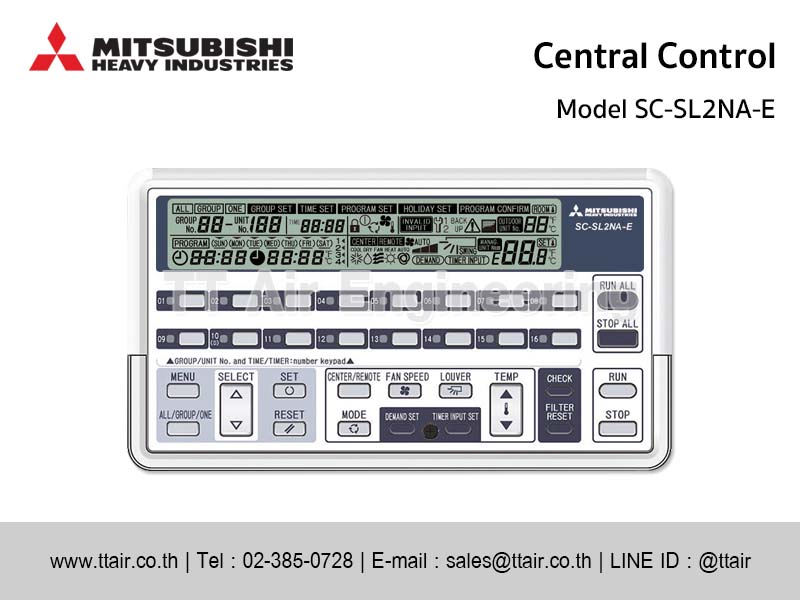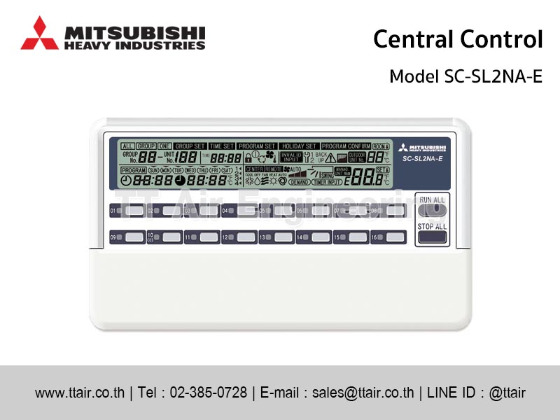 Central Control SC-SL2NA-E เป็นรีโมทควบคุมส่วนกลางแบบรวมศูนย์ของ Mitsubishi Heavy Industries สามารถควบคุมอุปกรณ์ภายในได้สูงสุดถึง 64 ยูนิต ทั้งแบบแยกส่วนหรือแบบรวมศูนย์ ด้วยการใช้งานที่ง่ายดาย ปรับแต่งการใช้งานได้หลากหลาย สั่งการทำงานเพื่อควบคุมอุณหภูมิของเครื่องภายใน Indoor Unit ได้อย่างแม่นยำ ด้วยความสามารถในการตั้งค่าอุณหภูมิที่เหมาะสมสําหรับทุกสภาพแวดล้อม