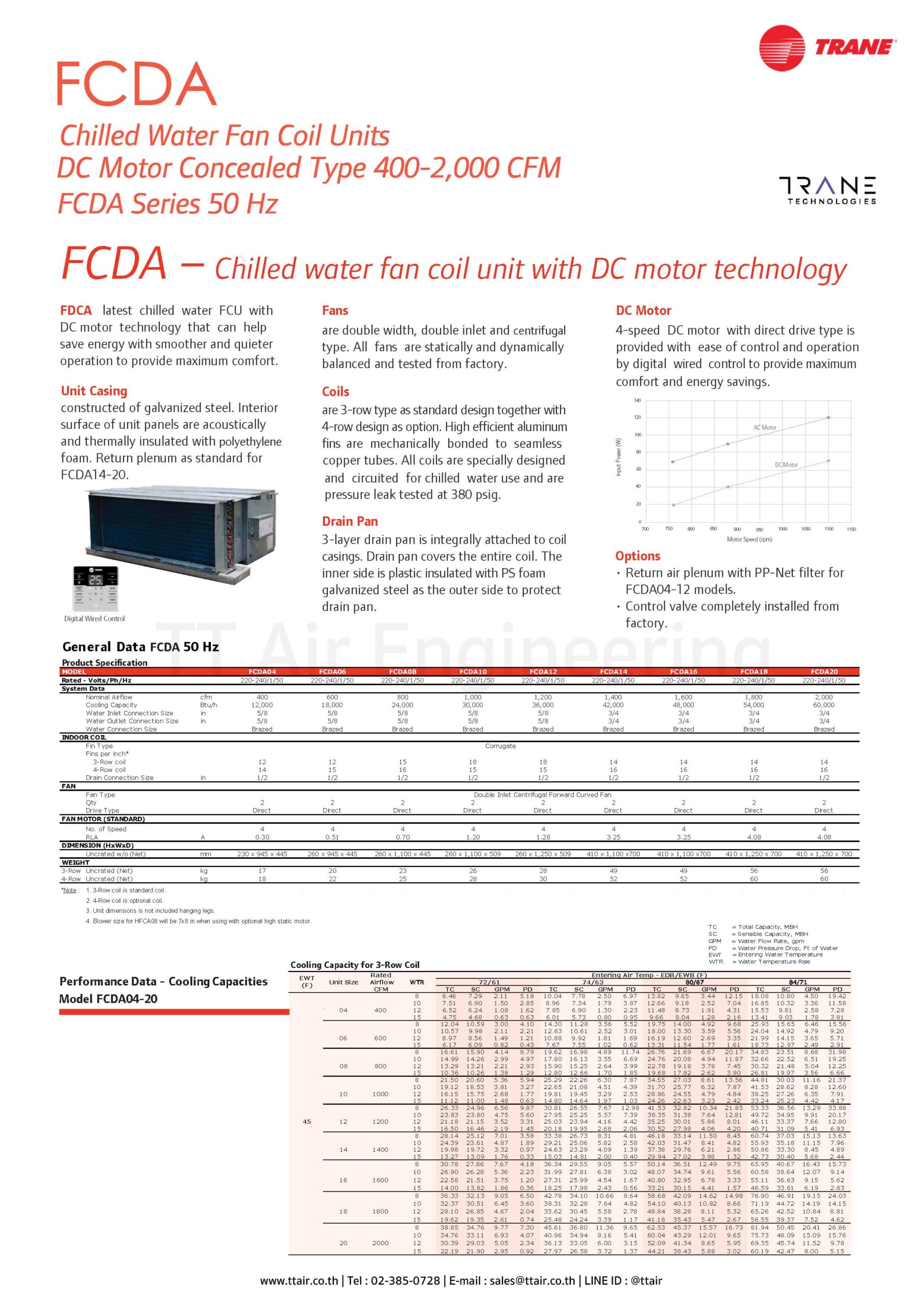 รายชื่อรุ่นแอร์คอยล์น้ำเย็น TRANE FCDA Series แบบท่อลม (Chilled Water, Ceiling Concealed)