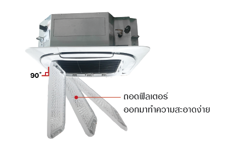 เปิดฝาตะแกรงลมกลับง่าย โดยตะแกรงจะยึดห้อยติดกับตัวเครื่องสามารถถอดฟิลเตอร์ออกมาทำความสะอาดได้ง่าย