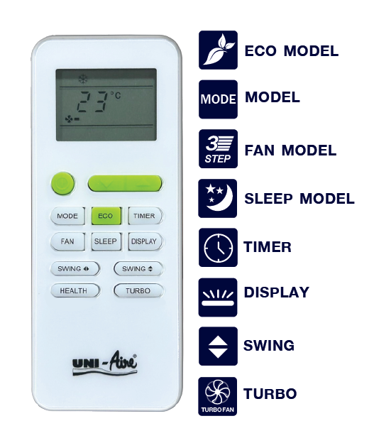 • TURBO มอเตอร์ส่งลมกำลังสูงให้ห้องเย็นเร็ว ส่งลมได้ไกล ให้ลมเย็นกระจายไกลทั่วห้อง